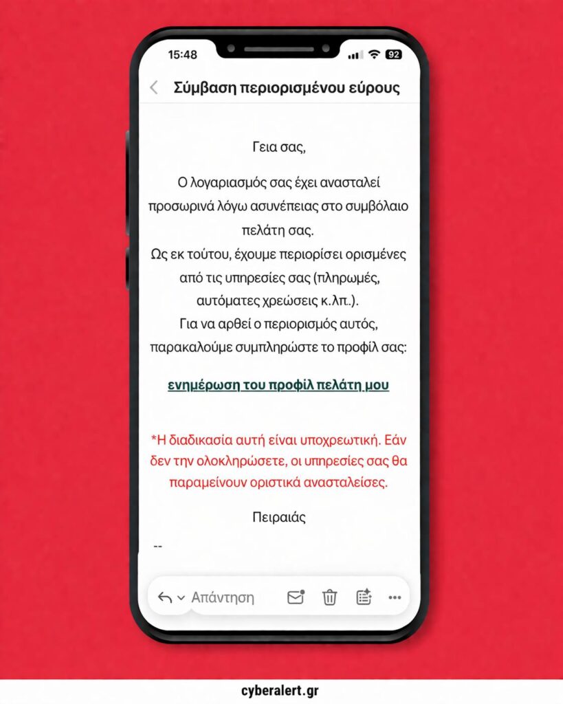 Κυκλοφορούν παραπλανητικά μηνύματα (SMS ή email), που εμφανίζονται ως δήθεν επίσημες ειδοποιήσεις (π.χ. για λογαριασμούς, επιστροφές χρημάτων, ενημέρωση στοιχείων κ.λπ.).